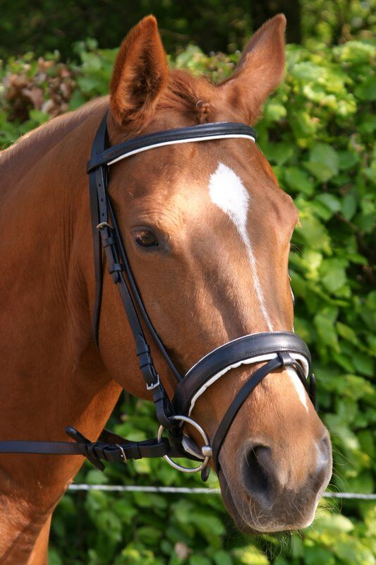 Wit onderlegd exclusief hoofdstel met brede aansnoerneusriem en RVS fournituren.