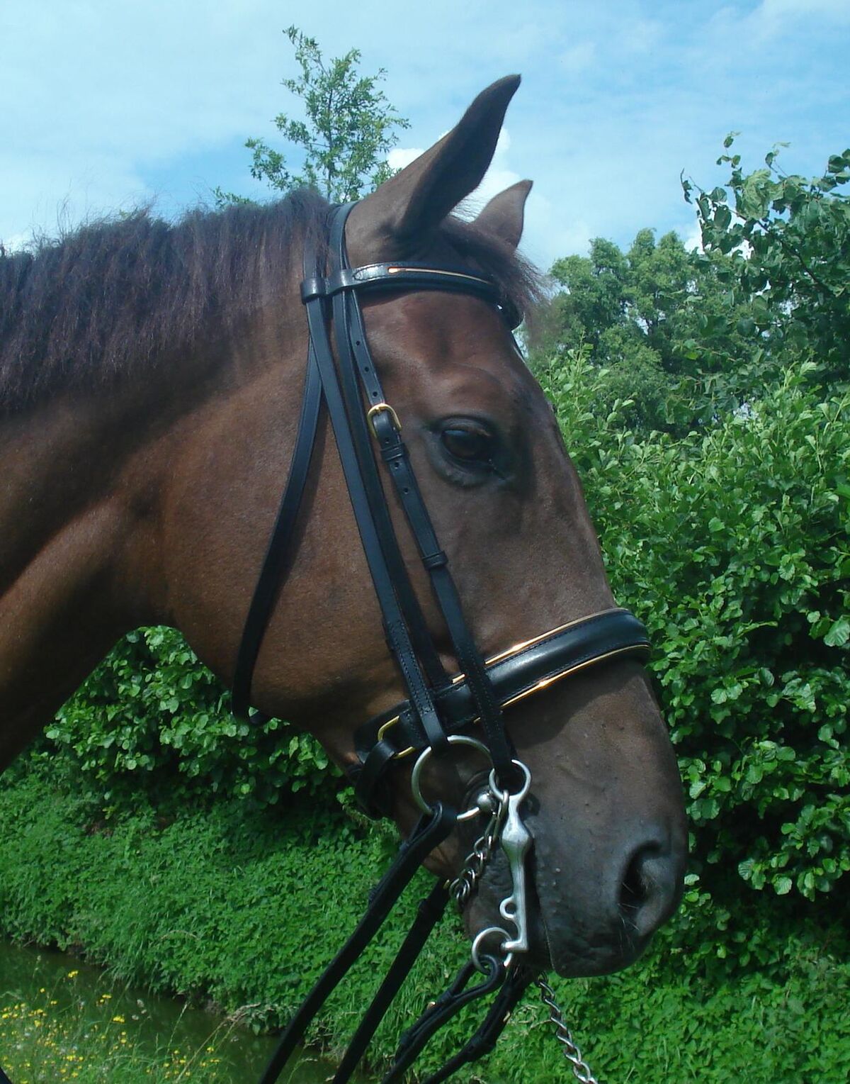 Stang- en trenshoofdstel met goudkleurige bies op frontriem en neusriem. Voorzien van gold plated fournituren.